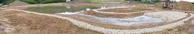 liebe Freunde und Förderer des BIOkybernetischen Zentrums AAChen,der Wassergarten im Rabental macht gute Fortschritte. Wie auf dem Bild zu erkennen, braucht es noch einige Tage bis er rundum fertig ist. Im Vordergrund rechts liegt das Schilfbecken, im Hintergrund rechts die Bucht, in der das Profil der Pflanzen vom Flach- bis Tiefwasser gepflanzt werden. Links liegt der Tiefwasserbereich und ganz links im Hintergrund die Bucht, an die der Rücklauf in den Dorbach angeschlossen wird.