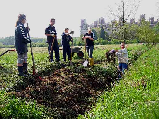 Zum Auftakt der Bauarbeiten haben SchülerInnen der Klasse 6a der Pestalozzi-Schule Alsdorf im Rahmen einer Projektwoche Arbeiten für den künftigen, naturnahen Unterhalt des Dorbachs durchgeführt.