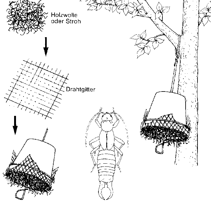 Ohrwürmer sind nachtaktiv, verbergen sich am Tage in dunklen, feuchtwarmen Verstecken. Als Unterschlupf nehmen Ohrwürmer gerne mit Holzwolle gefüllte Blumentöpfe (Nistglocken) an, die man an Stellen hängt - mit Ast- oder Stammkontakt - , wo es viele Blattläuse gibt. Wenn kein Blattlausbefall mehr festgestellt wird, muß der Ohrwurmtopf an einen anderen Ort plaziert werden, weil die Ohrwürmer sonst die eine oder andere Pflanze fressen.