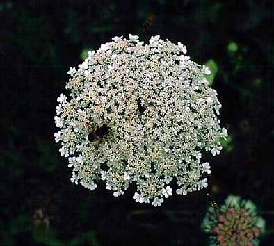 weißen Blüten. In der Mitte der Dolde befindet sich die typische