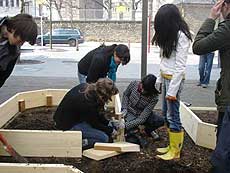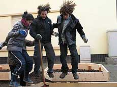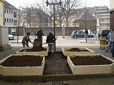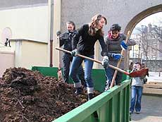 | Früh aufstehen, duschen, frühstücken und los ging's um 10 Uhr nach Luxemburg. Im Materiallager in der Rotunde 2 konnten wir uns „gartenfertig“ machen und uns mit Schaufeln bewaffnen. Dann haben wir uns auf den Weg zu dem Platz gemacht, an dem wir den Garten bauen sollten. Unser Weg war der kürzeste von allen Gruppen, nach 5 Minuten waren wir da. Das Baumaterial wurde auch sofort geliefert, so dass wir direkt anfangen konnten. Zum Glück hatte die Stadt das ca. 4 x 5 m große Beet, das bis dahin als Hundetoilette benutzt wurde, gesäubert! Zuerst musste etwas von der Erde abgetragen werden bevor wir die vorbereiteten Bretter einsetzen konnten. Wir hatten nämlich geplant, den Garten in 4 Bereiche zu teilen, die den Elementen Erde, Feuer, Wasser und Luft zugeordnet sind. Dort sollten später dazu passende Pflanzen eingesetzt werden, die Kaiser Karl in seiner Landgüterverordnung genannt hatte. In der Mitte ließen wir Platz für einen Weg, auf dem die Signatur Kaiser Karls mit Pflastersteinen nachgebildet werden sollte. |