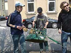Als alle Bretter zu Kästen zusammengebaut waren, haben wir angefangen, sie mit Erde zu befüllen. Nur fehlte uns dazu eine Schubkarre. Um die Ecke baute die Gruppe aus Nancy ihren Garten. Die hatten zum Glück einen Lieferwagen mit eigenen Geräten dabei. Doch was heißt Schubkarre auf Französisch? Das war dummerweise in keinem unserer Wörterbücher zu finden. Aber mit Zeichensprache haben wir es dann doch geschafft und sogar 2 Stück geliehen bekommen. Und ein paar Jungs aus Nancy haben uns beim Schaufeln geholfen.