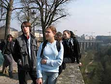 Besonders lustig waren zum Schluss die Versuche, die Wache vor dem Palast des Großherzogs zum Lachen oder Sprechen zu bringen. Wir haben es tatsächlich geschafft! Dann machten wir uns auf den Rückweg zu den Rotunden, wo schon der Bus auf uns wartete und uns zur Jugendherberge brachte. Dort war das Abendessen wohl noch nicht ganz fertig. Zuerst gab es Suppe, die nach Zwiebelsuppe aussah, aber auch mit viel Salz nach fast gar nichts schmeckte. Als nächstes wurden Mais, Rote Beete, Toastbrot und Nudeln gebracht. 0K, lustige Zusammenstellung, man wurde damit satt. Als die meisten von uns schon gegangen waren, gab es dann noch leckere Steaks und sogar selbst gemachtes, supersahniges Eis als Nachtisch. Danach haben wir uns alle zu einer Lagebesprechung getroffen. Manche haben am Abend noch das Château und die Gegend erkundet. |