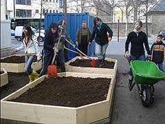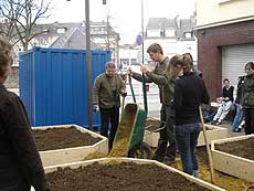 | Als wir dann an den Rotunden, und somit an unserem Materiallager, in dem bis zu dem Zeitpunkt immer mehr Gummistiefel und Gartenhosen lagerten, ankamen, zogen wir uns schnell unser „Arbeitszeug“ an und machten uns als geschlossene Aachener Gruppe auf den Weg zu unserem Beet. Da kamen wir um 10.10 Uhr an und machten uns sofort an die Arbeit. Diese bestand hauptsächlich aus dem Befüllen der Beetkästen. Das brachten wir auch relativ schnell hinter uns, da wir ja am Vortag schon den Hauptteil der Arbeit geleistet hatten. |
