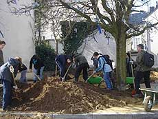 An sich ist das ja keine schwierige Sache, aber wir brauchten zum Unterfüttern unseres Kiesweges noch Sand, und den hatten wir nicht. Deshalb beschlossen wir eine Taktik für unsere „Charmeoffensive“ bei der Gruppe aus Nancy, die fast direkt neben uns arbeitete. Wir gingen sie besuchen um einen Tausch vorzuschlagen: „Wir bekommen 5 Schubkarren Sand und dafür helfen wir euch dann beim Schaufeln.“ Während der eine Teil unserer Gruppe versuchte diesen Satz in ein möglichst passables Französisch zu übersetzen, warteten die anderen geduldig auf den Kies für unsere Wege. Der kam allerdings nicht. Deshalb versuchten wir die Wege mit den Restbeständen unserer Muttererde, so gut wie es eben ging, auszuglätten. Das haben wir also bis 11 Uhr gemacht. Später konnten wir dann, mit Unterstützung von Dorothee Petzold, eine von 3 Europa-Praktikanten, die beim Paradies-Projekt mithalfen, zwei Schubkarren Sand in Empfang nehmen, die dann aber auch sofort(!).