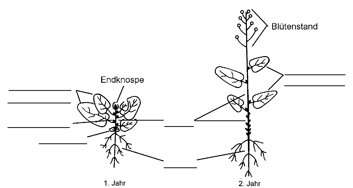 Ergänze das Schema des Lebensrhythmus des Wildkohls um die fehlenden Bezeichnungen und benenne die Teile der Pflanze, die in den genannten Kulturformen jeweils besonders entwickelt sind!