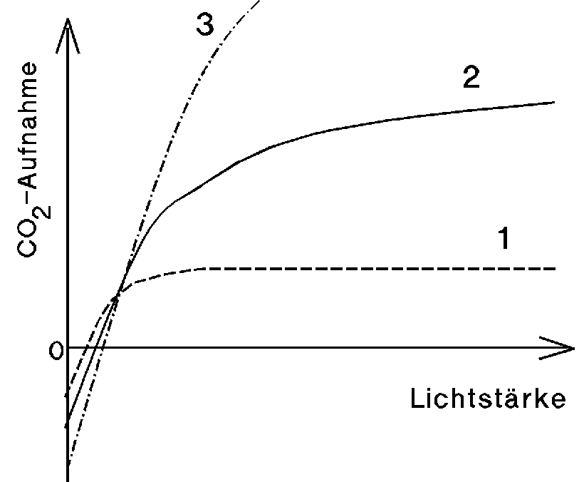 In Anpassung an ihren natürlichen Standort reagieren verschiedene Pflanzen ganz unterschiedlich auf die Erhöhung der Lichtstärke. Dies ist unten für drei Pflanzenarten dargestellt, wobei als Maß für die Photosyntheseleistung die Menge aufgenommenen Kohlendioxids benutzt wird.