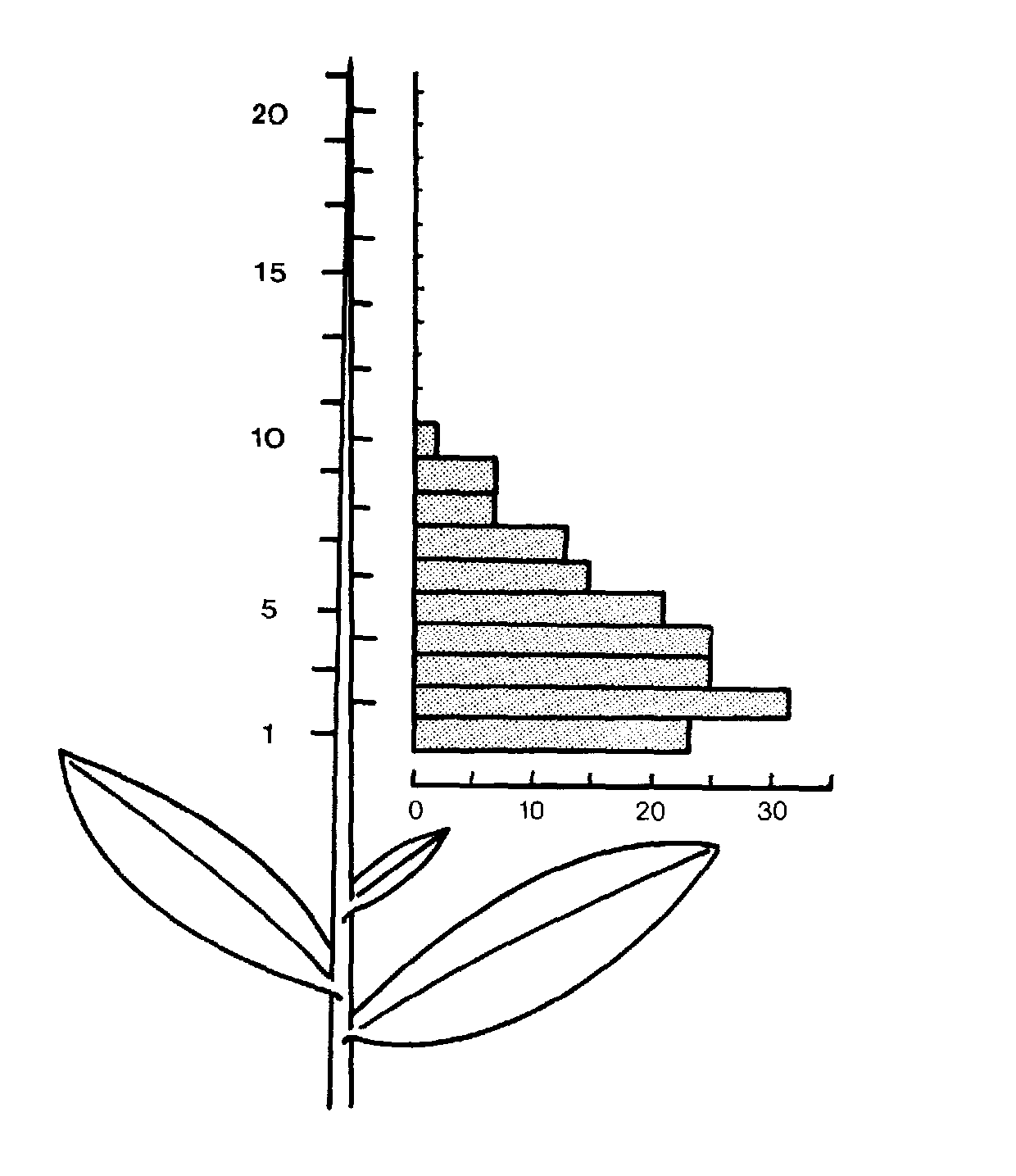 Abb.2: Fruchtansatz bei Dactylorhiza sambucina (Holunder-Knabenkraut) schematisch. In der Senkrechten sind die Blüten entsprechend der Reihenfolge ihres Aufblühens durchnummeriert. Das Blockdiagramm zeigt, an wievielen Pflanzen sich die jeweilige Blüte zu einer reifen Fruchtkapsel weiterentwickelt hat. Insgesamt wurden 64 Pflanzen einer Population in Niederösterreich untersucht. Nach VOGEL (1993).