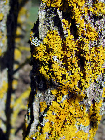 Die auffällige gelbe Flechte links ist Xanthoria parietina, die in der Eifel häufig auf den Borken von 'Bäumen wächst.