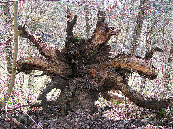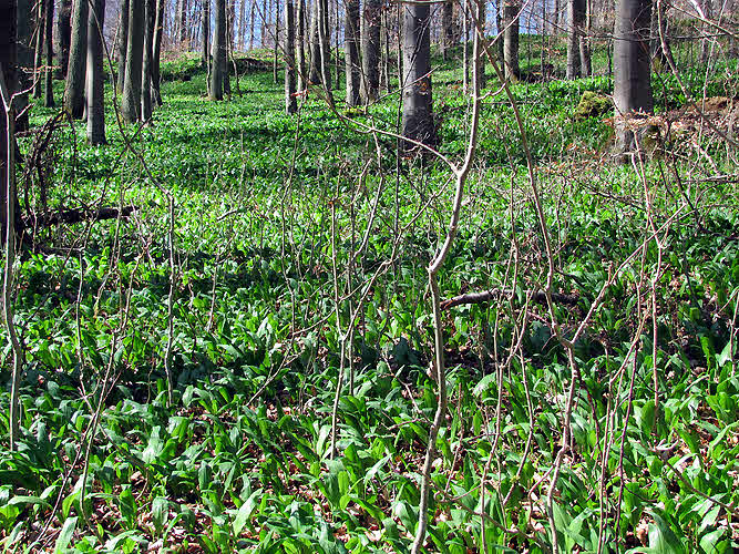 In dem Buchenwald hier gibt es einen spektakulären Massenbestand des Bärlauchs (Allium ursinum). Vor einigen Jahren hat der Kyrill-Sturm ordentlich abgeräumt; einige Wurzelteller umgestürzter Bäume sind heute noch zu finden (oben). Durch die naturnahe Altersstruktur mit vielen jüngeren Buchen hat sich der Wald ziemlich schnell wieder erholt. Auf der Wanderung zeigten sich die Bärlauchbestände unbeeindruckt. Die frischen Blätter waren unmittelbar zuvor ausgetrieben und verbreiteten im ganzen Wald den charakteristischen Geruch (unten).