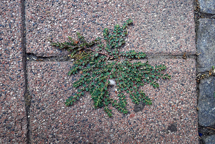 Davor, nur auf der anderen Straßenseite zur Peterskirche, wuchs im Pflaster und in einer Baumscheibe die Ungefleckte Wolfsmilch (Euphorbia prostrata). Das ist ein Neufund für Aachen und wieder mal ein Beleg für den Klimawandel. Die Art stammt aus dem tropischen und subtropischen Amerika.