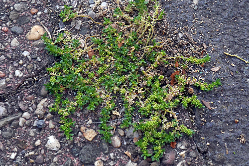 Dass Arten in Pflasterritzen alle so ähnlich aussehen, ist ein Beispiel für Konvergenz. Die extremen Standortbedingunfgen erfordern einfach kriechenden Wuchs, kleine Blätter und erlauben keine auffälligen Blüten. Deshalb sieht auch die mit Abstand häufigste Art solcher Stellen, der Sand-Vogelknöterich (Polygonum arenastrum ssp. calcatum) im Habitus genauso aus. Erst mit einer guten Lupe erkennt man an den Blüten und Früchten die Unterschiede, die eine Zuordnung zur richtigen Familie erlauben.