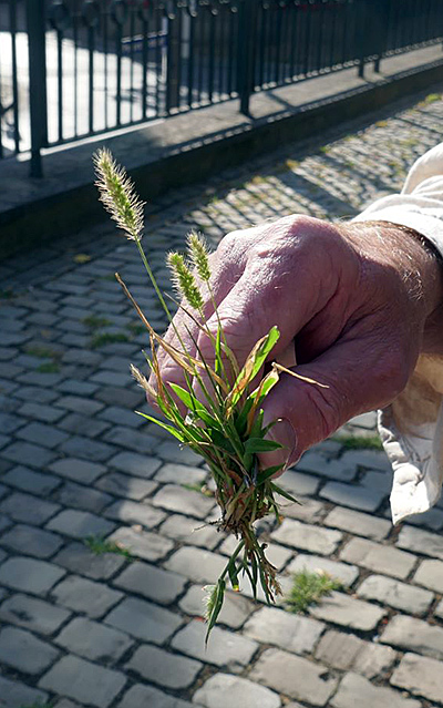 Es ging los am Platz vor der Kirche St. Peter am Bushof. Hier wurde die Grüne Borstenhirse (Setaria viridis, links) demonstriert. Auch kam hier der in Aachen inzwischen allgegenwärtige Gehörnte Sauerklee (Oxalis corniculata) vor. Auf dem Bürgesteig davor wuchs das Kahle Bruchkraut (Herniaria glabra, unten)