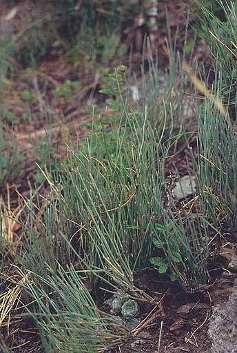 Links: Eine der größten botanischen Besonderheiten ist das Schweizer Meerträubel (Ephedra helvetica). Die unscheinbare, an Binsen oder Schachtelhalme erinnernde Art ist ein Nacktsamer, zu denen z.B. auch unsere Nadelgehölze gehören! Die Art wurde am 10. Juli nahe Schlanders gefunden.
