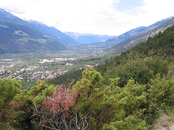 Blick ins obere Etschtal. Mitte links liegt der Ort Goldrain, ganz hinten Schlanders. Unser Quartier war in Vetzan,