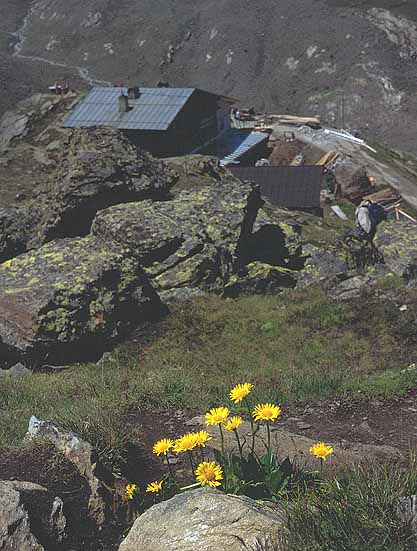 Von hier ging es auf alpinem Steig zur Martellhütte in 2600m Höhe, vorne Gletscher-Gemswurz (Doronicum glaciale)