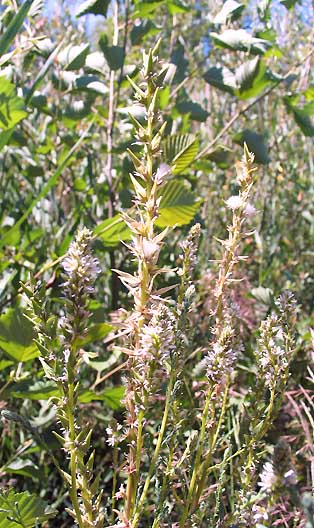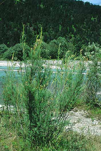 Am frühen Nachmittag führte ein Abstecher in den Prader Sand. Das ist ein kurzer, noch unverbauter Abschnitt eines Seitenbachs der Etsch, der noch jedes Frühjahr sein Schotterbett umverteilt und damit Platz für eine sehr spezielle Vegetation schafft.Eine botanischer Besonderheit dieses Biotops ist die Deutsche Tamariske (Myricaria germanica). Durch die Regulierung nahezu aller größeren Alpenbäche und -flüsse ist dieser Strauch extrem selten geworden. Unten links ist ein blühender Zweig, rechts der ganze Strauch abgebildet.