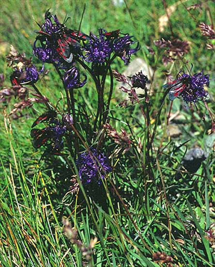 Zurück führte der Weg durch blumenreiche Wiesen mit auffällig viel Schmetterlingen.Links "überfällt" eine Gruppe Blutströpfchen (Zygaena spec.) einen Horst der Halbkugeligen Teufelskralle (Phyteuma hemisphaericum).