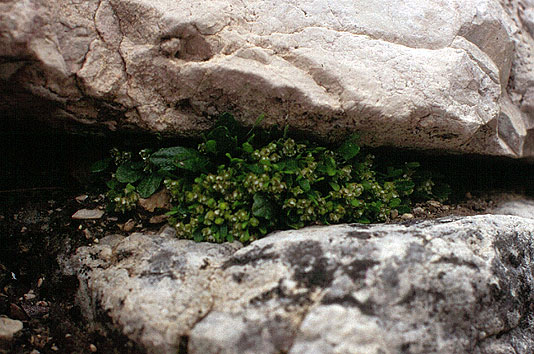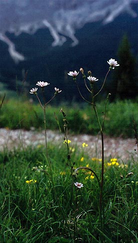 Ein Bus brachte uns am 27. Juni zum Würzjoch, von wo der Weg rund um den Peitlerkofel führte. In der steilen Peitlerscharte wurde das extrem seltene Zwergkugelschötchen (Rhizobotrya alpina) (oben) gefunden, das ausschließlich in den Dolomiten vorkommt.