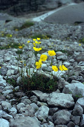 Zurück ging es über die Dolomit-Schutthalden am Fuße des Kreuzkofels (links). Charakterart dieser Schutthalden ist der Rhätische Alpenmohn (Papaver alpinum ssp. rhaeticum) (unten links). Die Mehrheit der Exkursionsgruppe interessierte sich an der gleichen Stelle allerdings mehr für die "Schneegrotte" (unten rechts - ganz hinten!).