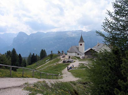 Die nächste Tour führte zur bekannten Wallfahrtskirche Heilig Kreuz (rechts). Der Weg dahin führte über außerordentlich blumenreiche Wiesen, oben vor der wolkenverhangenen Kulisse des Kreuzkofels.