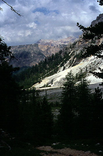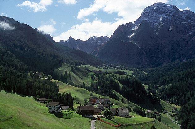 Wengen liegt in einem Seitental des Gadertals, das seinerseits nach Norden im Pustertal mündet. Das Haus ganz links (in etwa 1/3 Bildhöhe) war unsere Unterkunft, der Berggasthof Ciurnadù. Rechts erhebt sich der Kreuzkofel, an seiner linken Flanke liegt das das Val de Fanes, das über die Antoniusscharte ins Fanes-Gebiet führt, das Schauplatz von uralten ladinischen Sagen und Mythen ist.