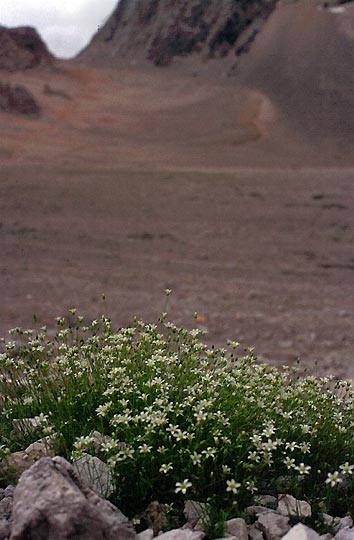 Rechts: Zu den charakteristischen Arten gehört auch die Österreichische Miere (Minuartia austriaca). Im unscharfen Hintergrund ist die Antoniusscharte zu erkennen.