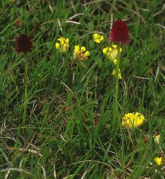 Nach einem brutal steilen Aufstieg folgte ein Sattel mit sanft geschwungenen Rasen. Hier wurden gleich drei verschiedene Köhlröschen-Arten gefunden: oben (links) das Gewöhnliche Kohlröschen (Nigritella rhellicani) und das Rote Kohlröschen (N. rubra) (rechts). In unmittelbarer Nähe wuchs auch noch das Dolomiten-Kohlröschen (N. dolomitensis) (Abb. rechts), das durch den purpurnen Farbstich der Blüten und die relativ späte Blütezeit gekennzeichnet ist.