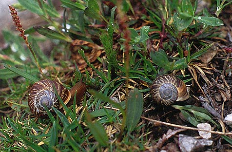 In der Scharte fielen auch stark gemusterte Schnecken auf. Dabei handelt es sich um die Baumschnecke (Arianta arbustorum), die auch in niederen Lagen vorkommt, aber nur im Bergland so intensiv gefärbte Schalen produziert. Von der vielgestaltigen Art sind viele Unterarten beschrieben worden. Vermutlich handelt es sich aber um die Typusform (Arianta arbustorum arbustorum).