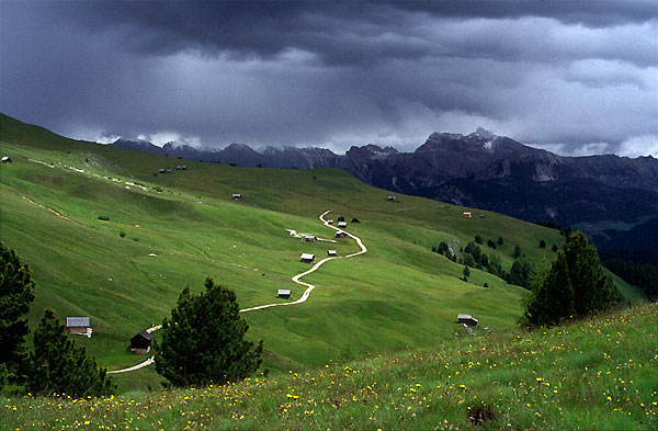 Unten: Hinter der Peitlerscharte wandelte sich das Landschaftsbild erheblich. Auf der Südseite des Peitlerkofels erstreckten sich die ausgedehnten, sehr blumenreichen Peitlerwiesen, durch die sich der Wanderweg entlang zahlreicher Heustadel zog. Der Himmel zeigte sich bereits grau verhangen, richtig erwischt hat es uns aber erst in sicherer Unterkunft in einer Jausenstation kurz vor dem Würzjoch.