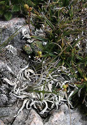 Ein Spezialist für hochalpine Lagen ist auch die Totengebeinflechte (Thamnolia vermicularis), hier in einer Steinnische zwischen Polstersegge (Carex firma) und Blaugrünem Steinbrech (Saxifraga caesia).