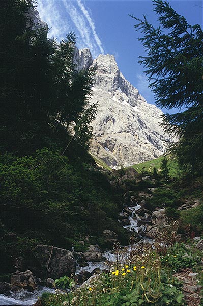 In der Gegenrichtung geht der Blick über das Tal des Valentinbaches zum Rauchkofel. Der eigentliche Talschluss ist das Valentintörl an der linken Flanke des Rauchkofels.