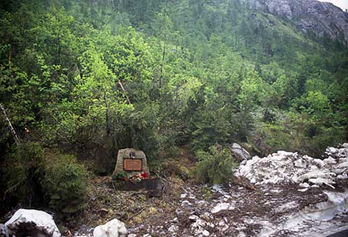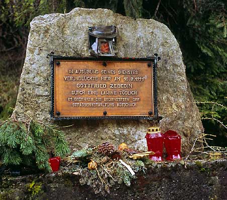 Der steile Einschnitt am Plöckenpass war und ist stark von Lawinen und Erdrutschungen bedroht. Die Tafel links gedenkt einem 1991 bei Straßenarbeiten umgekommenen Bauarbeiter, und das aktuelle Bild vom Juli 2009 (unten) belegt, dass man sich auch heute noch möglichst nicht zu lange in diesem Abschnitt der Straße aufhalten sollte...