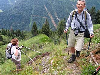 Am nächsten Tag führte ein Steig direkt hinter der Valentinalm 600m hinauf zum Hinterjoch. In der Nacht hatte es stark geregnet, so dass der Weg auf lehmigem Grund sehr rutschig war, was beim Abstieg noch mehr als beim Aufstieg auf die „Stoßdämpfer“ ging.