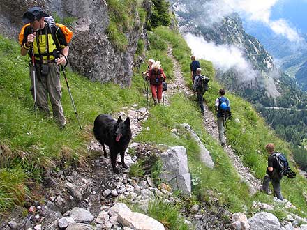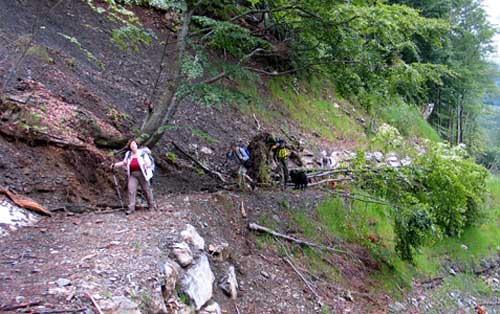 Am 5. Juli ging es zum Einlaufen in einer leichten Tour zum Plöckenpass und zum Gasthof Plöckenhaus. Da es in dem engen Tal nur einen Wanderweg in diese Richtung gab, mussten wir häufiger diesen Weg benutzen. Die engen Täler mit den steilen Hängen sind stark rutschgefährdet, so dass der Weg mehrfach blockiert oder selbst etwas weggerutscht war.
