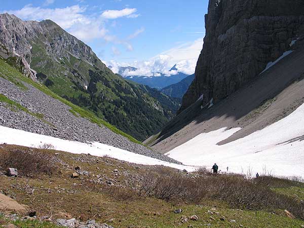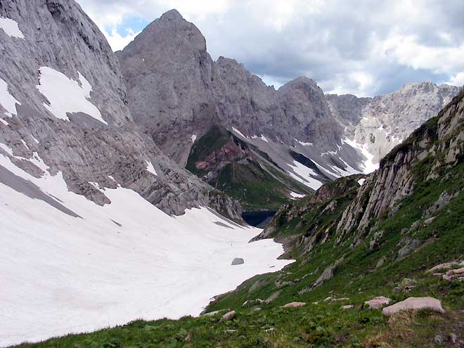 Weiter ging es dann über große Schneefelder aufwärts (oben), bis schließlich das Valentintörl erreicht war, das knapp 1000m über unserer Unterkunft liegt (rechts). Zur anderen Seite (unten) führte der Pfad zum Wolayersee wieder über Schneefelder. Nur einige Teilnehmer sind bis zur Hütte am See gelaufen, die meisten kehrten schon am Valentintörl um.