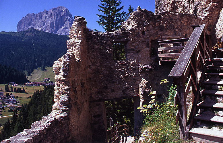 Den deutschen Namen Wolkenstein hat der Ort vom Adelsgeschlecht derer von Wolkenstein, dessen bekanntester Vertreter der Dichter Oswald von Wolkenstein ist. Seine Stammburg, in der sich der umtriebige Mensch wohl nur im Sommer aufgehalten hat, ist noch als Ruine erhalten. Die Burg stammt aus dem 13. Jahrhundert. Als Zollburg an einem äußerst bedeutenden Handelsweg der damaligen Zeit über das Grödnerjoch und das Gadertal war der Standort sehr lukrativ. Dummerweise hat man nicht darauf geachtet, dass der Fels darüber ziemlich bröckelig ist. Zu Beginn des 16. Jahrhunderts ist die Burg deshalb aufgegeben worden.