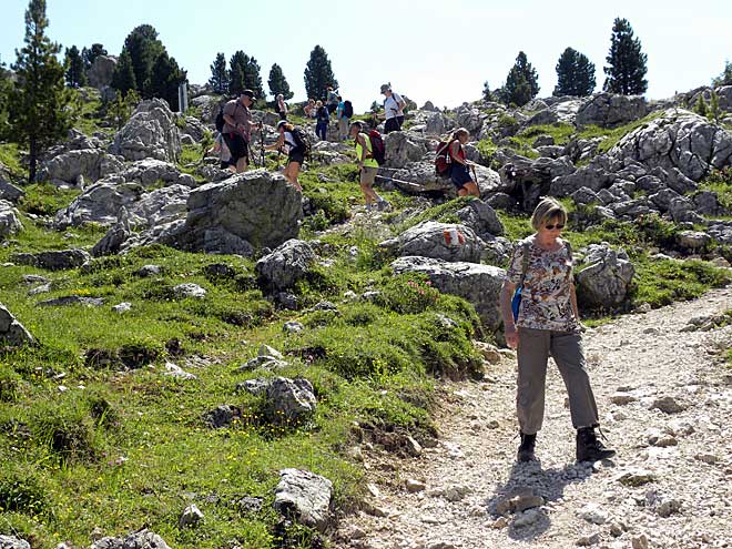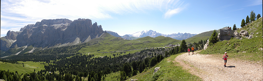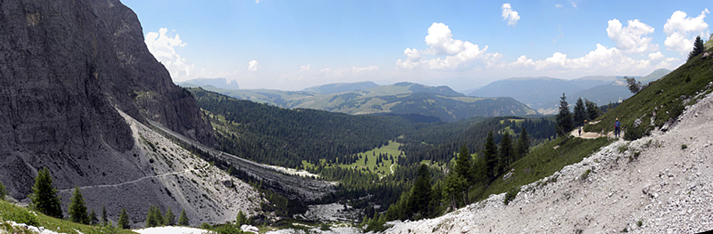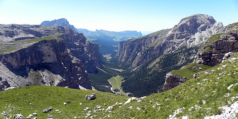 Am 10. Juli, gab es kein gemeinsanmes Programm mehr. Die größte Gruppe machte eine Bergtour vom Grödnerjoch über den Dolomitenhöhenweg und das Langental zurück nach Wolkenstein. Unten der Aufstieg vom Grödnerjoch. Unter der Sellagruppe links ist die Passstraße zu erkennen. Die Häuser hinten rechts unten markieren die Passhöhe. Darüber ist in der Ferne auch noch die schneebedeckte Marmolada zu erkennen.