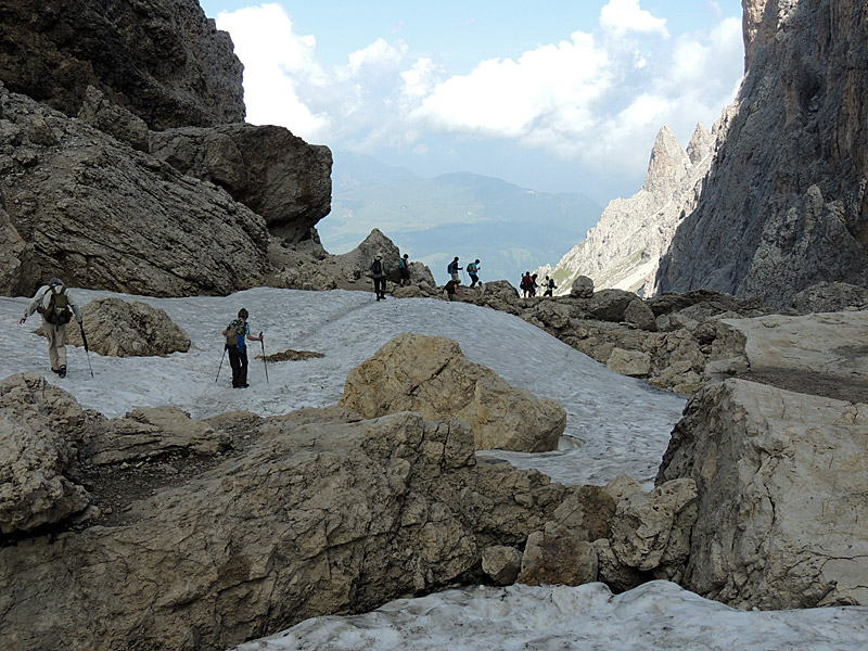 Am folgenden Tag stand das Sellajoch an, von dem es mit der Seilbahn zur Langkofelscharte auf ca. 2700m ging. Der Abstieg Richtung Wolkenstein war dann erstmal steil und unangenehm. Unmittelbar hinter der Scharte musste sogar noch ein Schneefeld bezwungen werden.