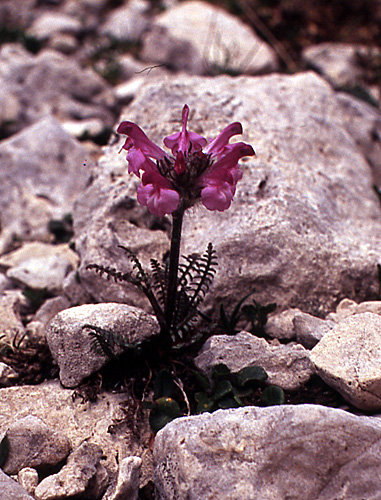Offensichtlich ist der oberste, steilste Abschnitt noch sehr in Bewegung. Die Vegetation war sehr spärlich und beschränkte sich auf die „üblichen Verdächtigen“ wie Alpen-Gänsekresse (Arabis alpina), Blattlosen Steinbrech (Saxifraga aphylla), Zwerg-Miere (Minuartia sedoides), Dolomiten-Schafgarbe (Achillea oxyloba) und die hochalpine Form des Bayerischen Enzians (Gentiana bavarica var. subacaulis). Herausragend war allerdings der Fund des Rosatroten Läusekrauts (Pedicularis rosea, Abb. rechts).