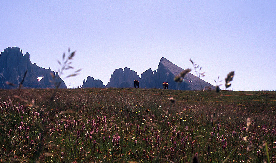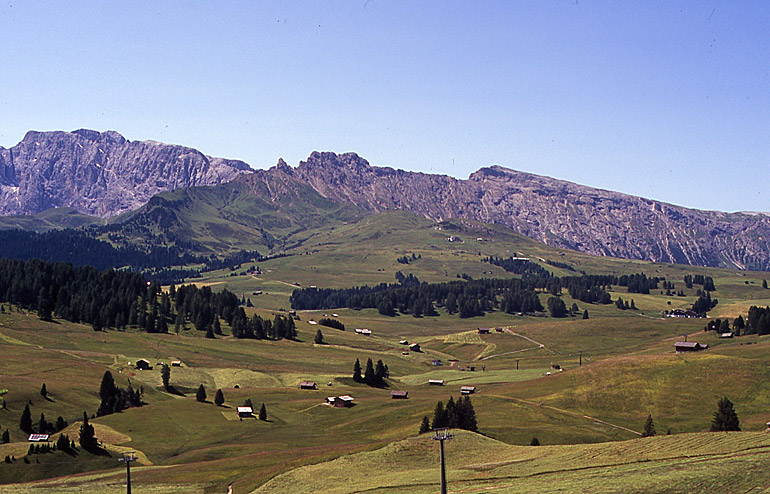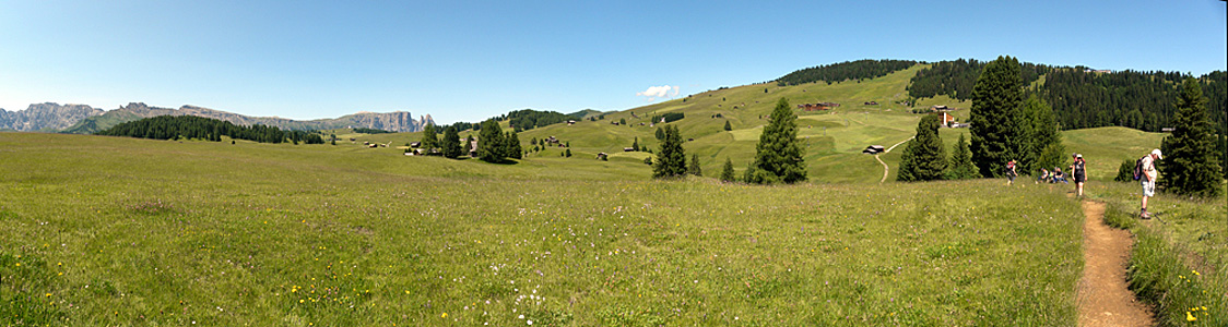 Am 9. Juli ging es dann mit Bus (nach St. Ulrich) und Seilbahn auf die legendäre Seiser Alm. Nach Südwesten geht der Blick von der Seilbahnbergstation zum Schlern (links), nach Süden erschließt sich die ganze Hochfläche der Seiser Alm. (unten)