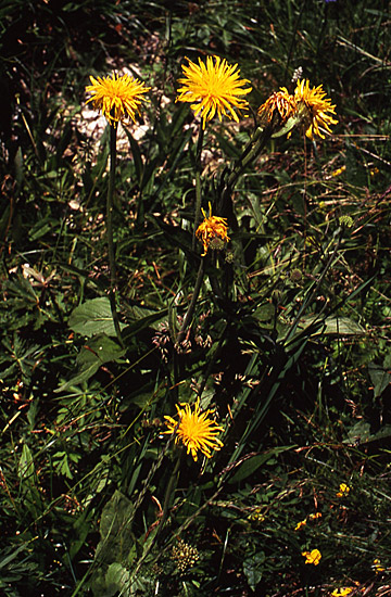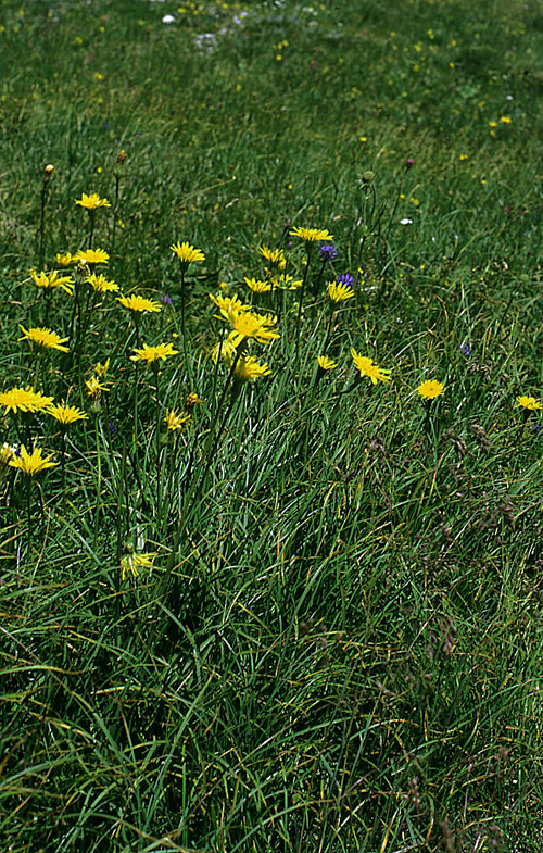Die Blumenwelt am Grödnerjoch ist äußerst vielfältig. Als Beispiel ist links die Grannen-Schwarzwurz (Scorzonera aristata) abgebildet.
