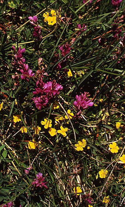 Mit den riesiegen Blütenköpfen ist der Berg-Pippau (Crepis pontana, Abb. links) sehr auffällig. Die Abbildung rechts zeigt eine bunte Mischung der roten Berg-Esparsette (Onobrychis montana) mit dem Alpen-Sonnenröschen (Helianthemum oelandicum ssp. alpestre).