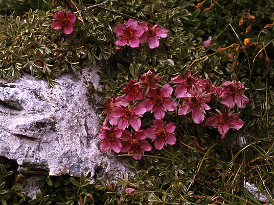 Unter der Langkofelhütte weitete sich das Tal und der Weg führte rechts an der Nordflanke des Langkofels zur Seilbahn nach Wolkenstein. Hier wurde dann auch das Dolomiten-Fingerkraut (Potentilla nitida) angetroffen, ein Endemit und geradezu Symbolblume der Dolomiten.