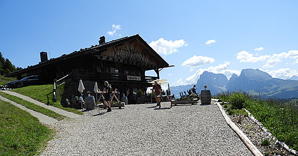 Mit dem Bus ging es nach Saltria und von dort mit der Seilbahn zur Williams Hütte auf 2.100m ü.NN. Von da aus auf einer breiten aber steilen Fahrstraße zur Plattkofelhütte (rechts), die auf dem Fassajoch am Fuß des Plattkofel liegt.