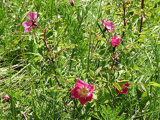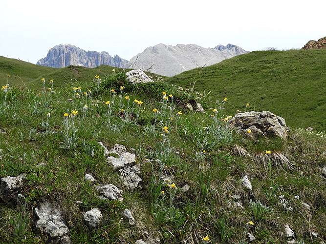 Auf dem Rückweg über die nördliche Seite des Puflatsch fanden wir die echte Alpen-Rose (Rosa pendulina) und die Türkenbund-Lilie (Lilium martagon), im Hintergrund das Grödnertal. Die Wiesen enthielten spektakulär viel Arnika. Die Hütte, auf der wir eine Rast einlegten, war dann bezeichnenderweise die Arnika-Hütte.
