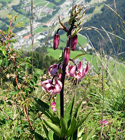 Bevor der eigentliche Touristensteig anfängt, führte der Weg über hochgelegene Almen. Hier erregte eine Feuer-Lilie (Lilium bulbiferum) die Aufmerksamkeit.