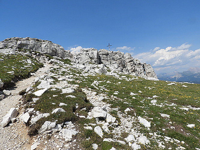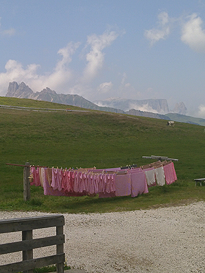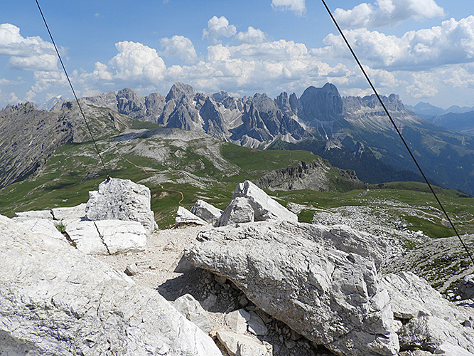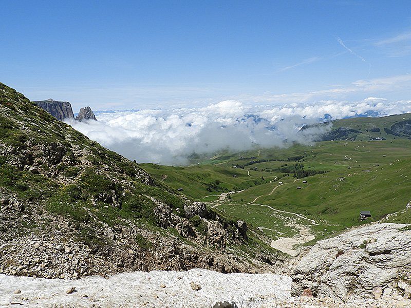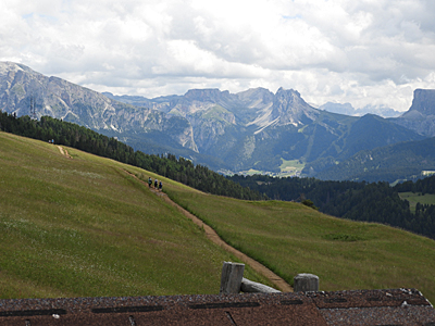 Am letzten Tag ging die Wanderung über den Piz zur Bergstation der Seilbahn, die von St. Ulrich im Grödnertal auf die Seiser Alm führt. Von dort hatte man einen freien Blick auf die Sella-Gruppe, Langkofel und Plattkofel (unten links) und den Puez (unten rechts), der auf der anderen Seite des Grödnertals liegt.