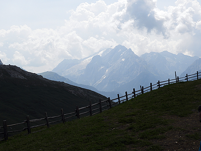 Von hier hatte man einen guten Blick auf die Marmolada (unten), deren Gletscher schon deutlich über mindestens ein Drittel der ursprünglichen Masse zurückgeschmolzen ist.