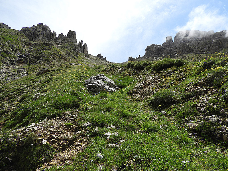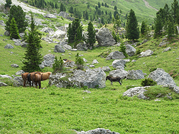 Einige sind dann nach einem kleinen Abstecher zur Melga de Luch-Hütte, um Bergkäse und Brot zu kaufen, ein Stück höhenparallel um den Plattkofel gelaufen, um dann über eine alte und überwachsene Blockhalde (unten links) zur Murmeltierhütte abzusteigen.